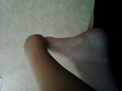 Footjob и свършват на краката в тен чорапи